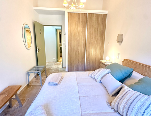 Designed for up to 4 guests, it features a fully equipped kitchen, two bathrooms, a private terrace overlooking the garden, and access to the pool.