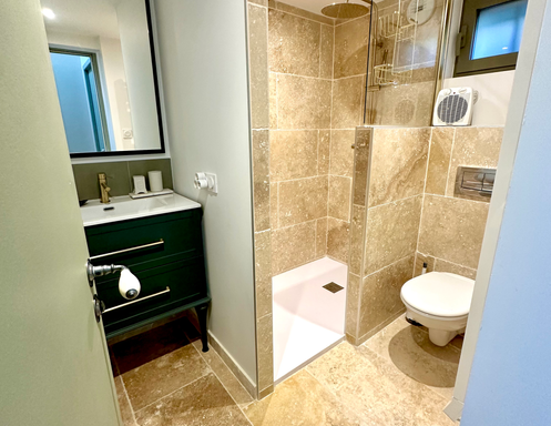 Two bathrooms, including one with a shower, a hair dryer, bath towels, and a handmade soap from Agua Salada.